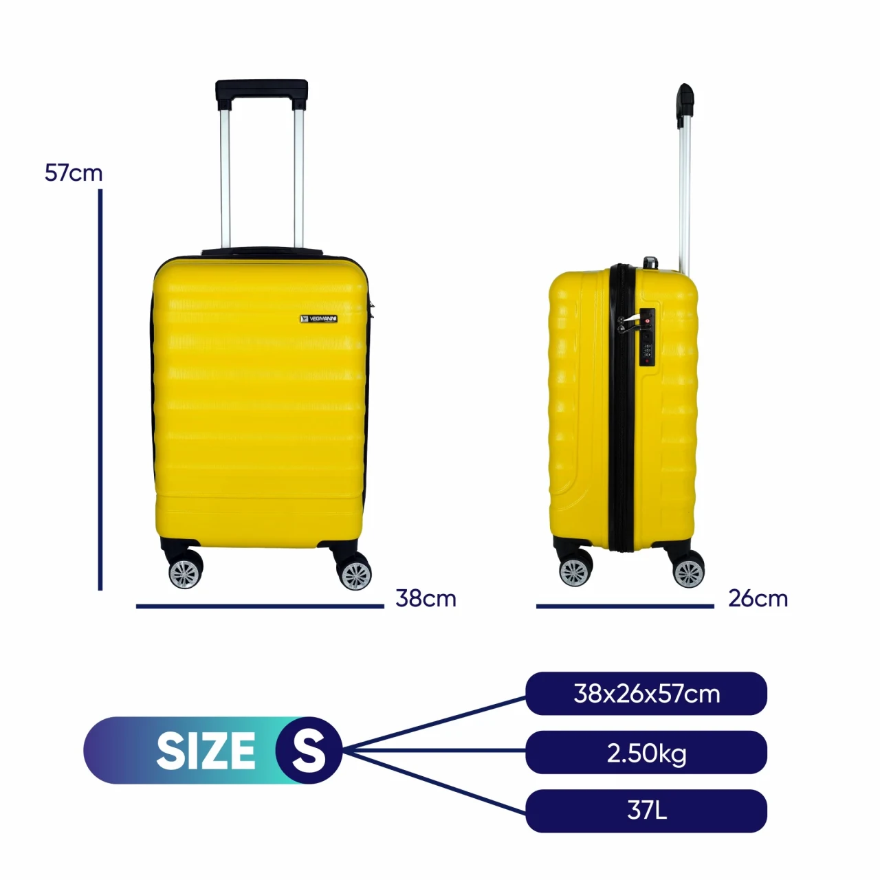 •  El bagajı valizi (boyutlar: 57x38x26 cm; ağırlık: 2,5 kg, hacim: 37 L),hemen hemen her havayolu için uygundur.