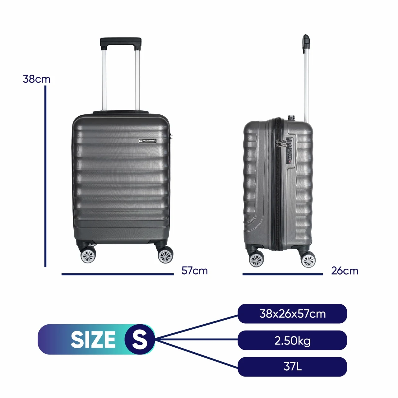 •  El bagajı valizi (boyutlar: 57x38x26 cm; ağırlık: 2,5 kg, hacim: 37 L),hemen hemen her havayolu için uygundur.