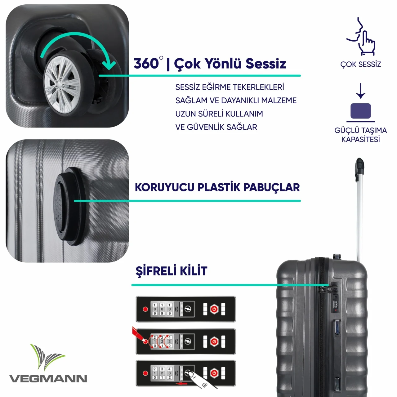 • Ağırlığı dengeleyip taşımayı kolaylaştıran, kauçuk-silikon malzemeden üretilmiş 360 derece dönebilen 4 adet tekerlek sistemi Sık dişli kalın fermuarlar Muadillerine göre daha hafif gövde yapısı ile bagaj kotası dostudur.