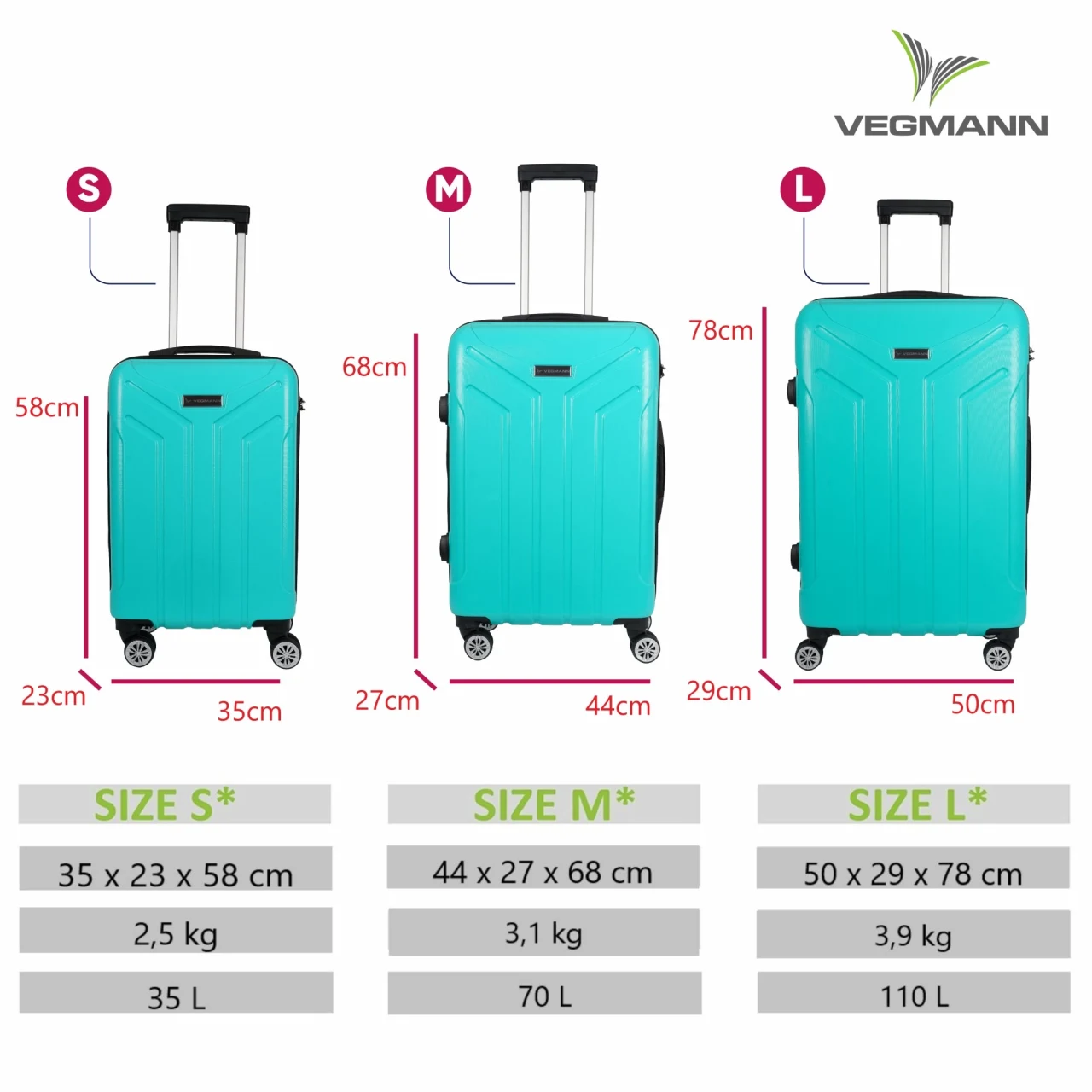 • 3 parçalı valiz seti, büyük valiz (boyutlar: 78x50x29 cm; ağırlık: 3,9 kg; hacim: 100 L),orta boy valiz (boyutlar: 68x44x27 cm; ağırlık: 3,1 kg, hacim: 70 L) ve El bagajı valizi (boyutlar: 58x35x23 cm; ağırlık: 2,5 kg, hacim: 34L),hemen hemen her havayolu için uygundur.